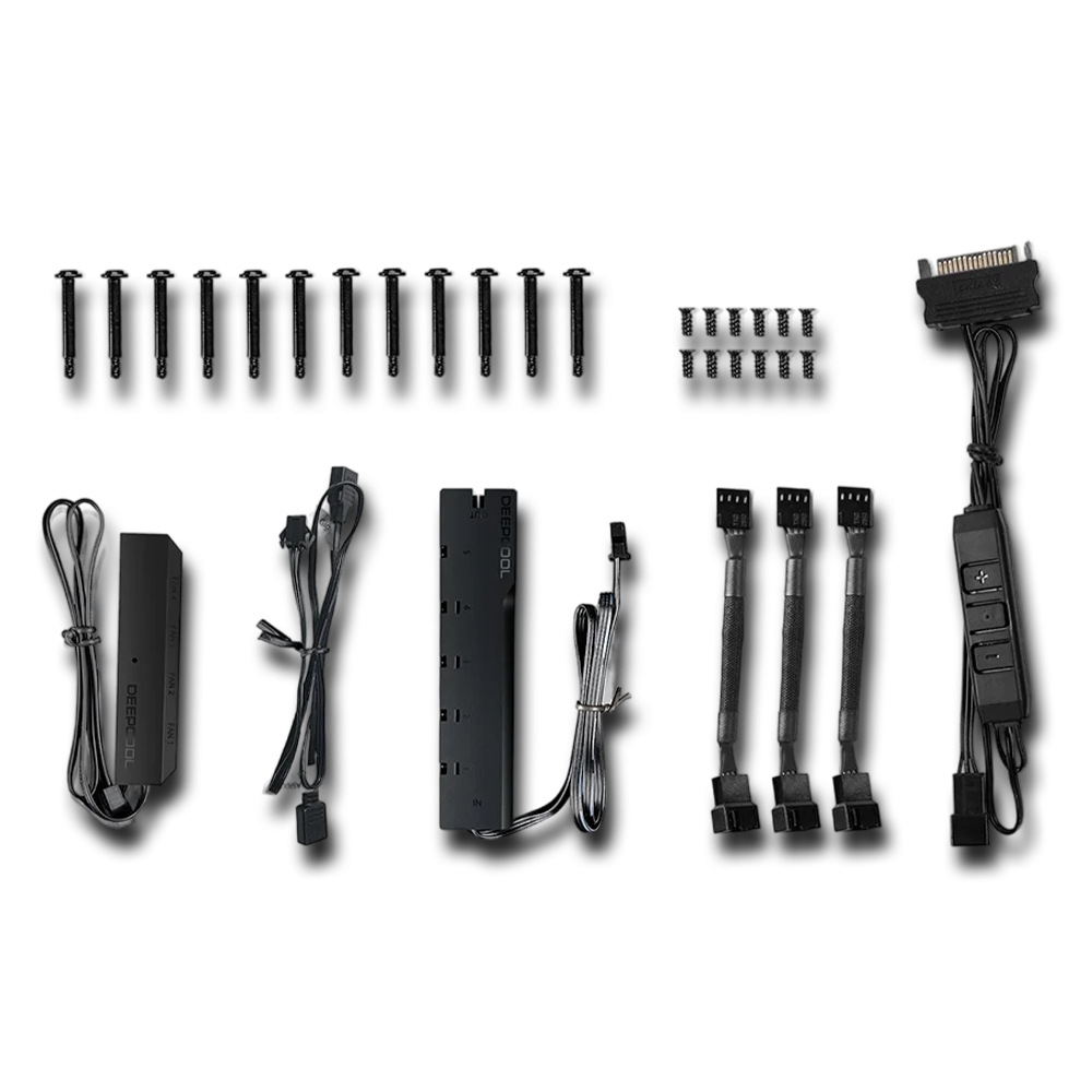 Janköýer - 3 sany kompýuter, dolandyryş gözegçisi, dolandyryjy we janköýerler üçin SATA elektrik kabeli, PWM kabeli, 3 sany fan birikdiriji kabeli, janköýerleri düzeltmek üçin 12 sany silikon taýajyk we nurbat, kontrolleýeri düzeltmek üçin iki taraply lenta we nurbat, gurnama gollanmasy